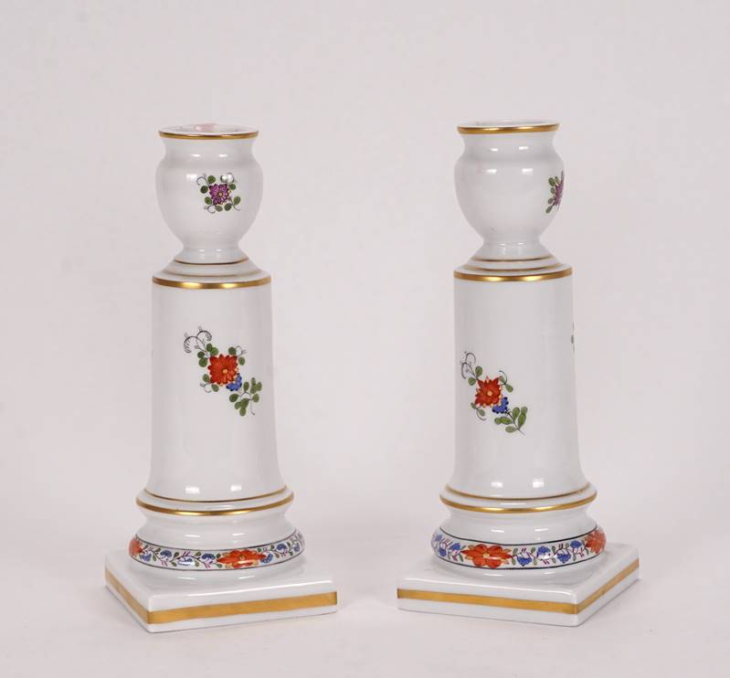 Porzellanmanufaktur Meissen 20. Jh. Indische Blumenmalerei, zweiteilig, mit Goldrand. Einflammige Leuchter auf quadratischer Plinthe und rundem Schaft. Unter dem Boden je unterglasurblaue Schwertermarke (1. Wahl) mit Beistrich, Malermarke und Formnummer sowie ehemaliges Verkaufsetikett. Größe ca. 6 x 6 cm. Höhe ca. 16 cm. Teils Wachsreste.
