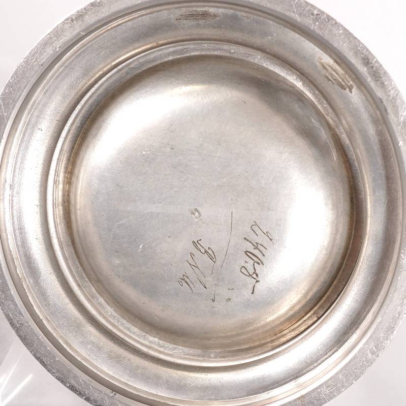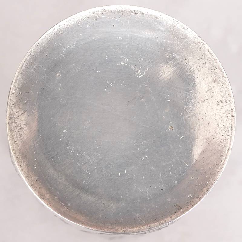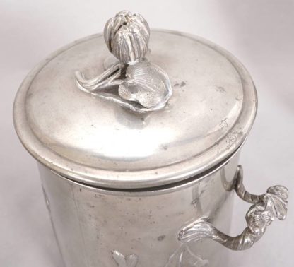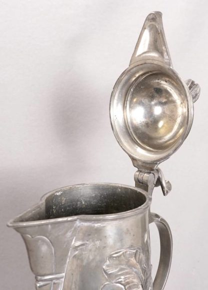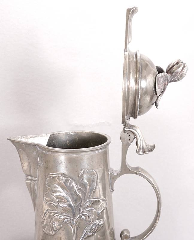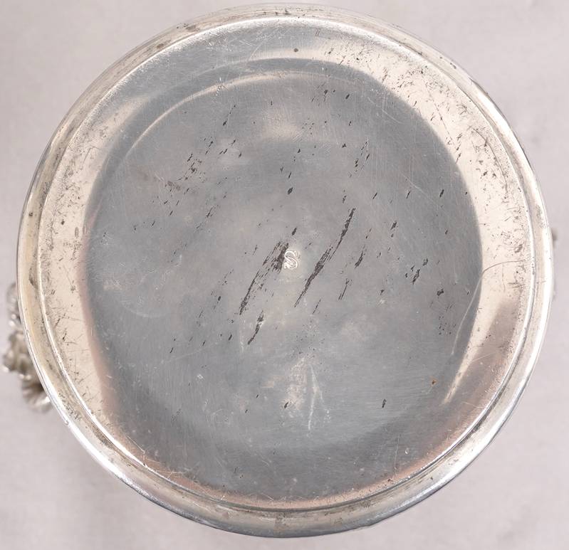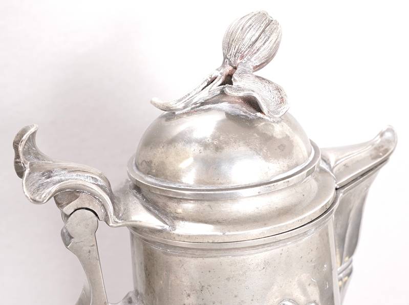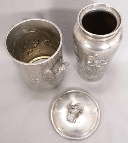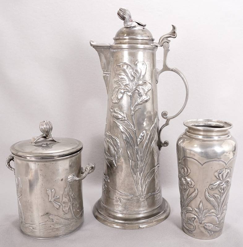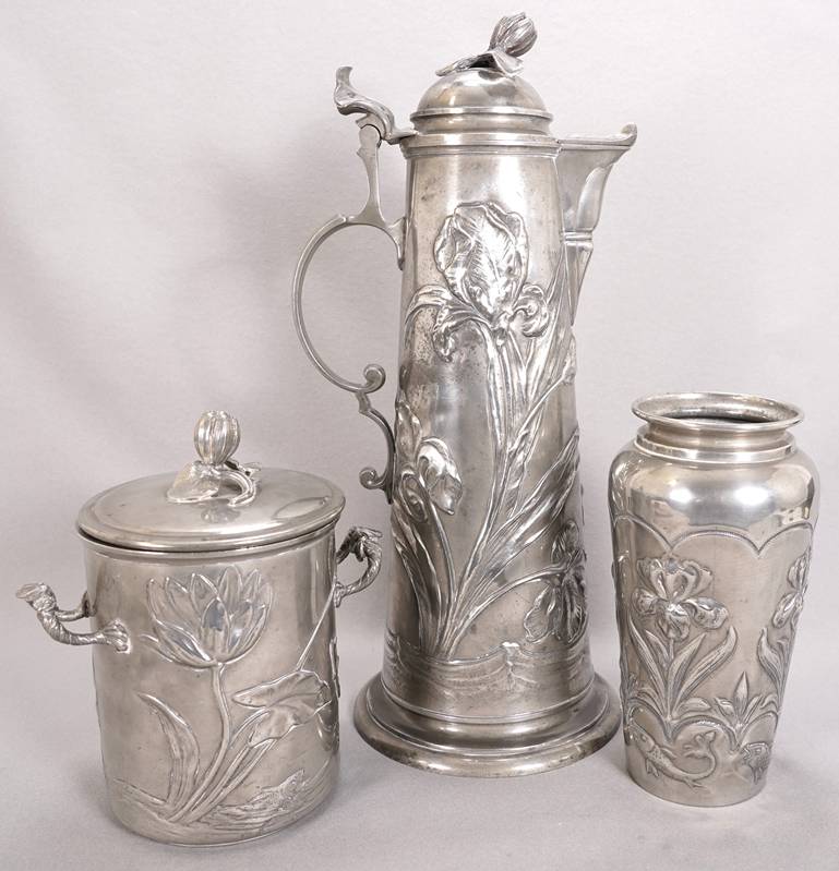 Eine Kanne, ein Topf und eine Vase aus silberfarbenem Metall mit reliefiertem Floraldekor auf der Wandung. Kanne unter dem Boden punziert mit "H", Topf mit "S". Durchmesser der Kanne ca. 17 cm, Höhe ca. 43 cm. Gesamtgewicht ca. 3,2 kg. Altersbedingter Zustand wie abgebildet, Deckel des Topfs wackelt, bitte selbst besichtigen.