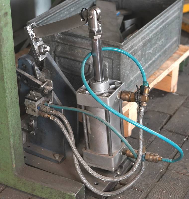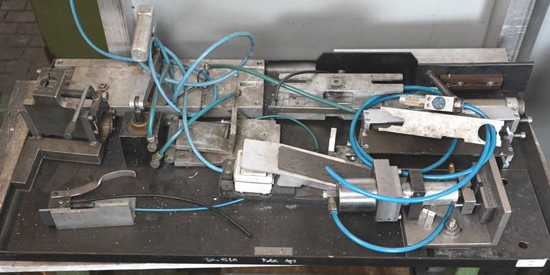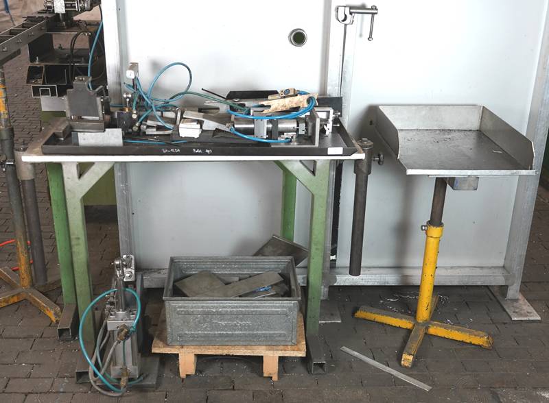 Werktisch teils beladen mit Festo Hydraulikwerkzeugen etc. auch darunter.