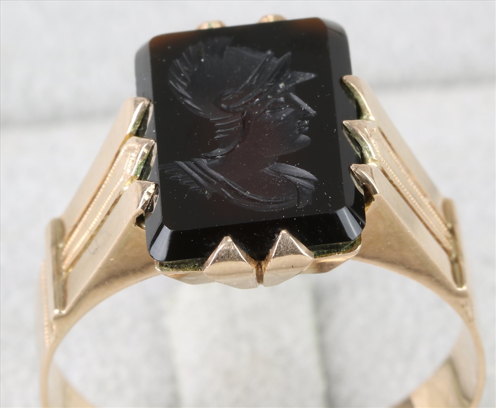 Deutsch 20. Jh. GG 585. Glatte, oben profilierte Schiene mit eingesetztem schwarzem Lagenstein mit geschnittenem Kriegerkopf. Ringgröße ca. 19,5 bzw. 61, Gewicht ca. 4,3 Gramm.