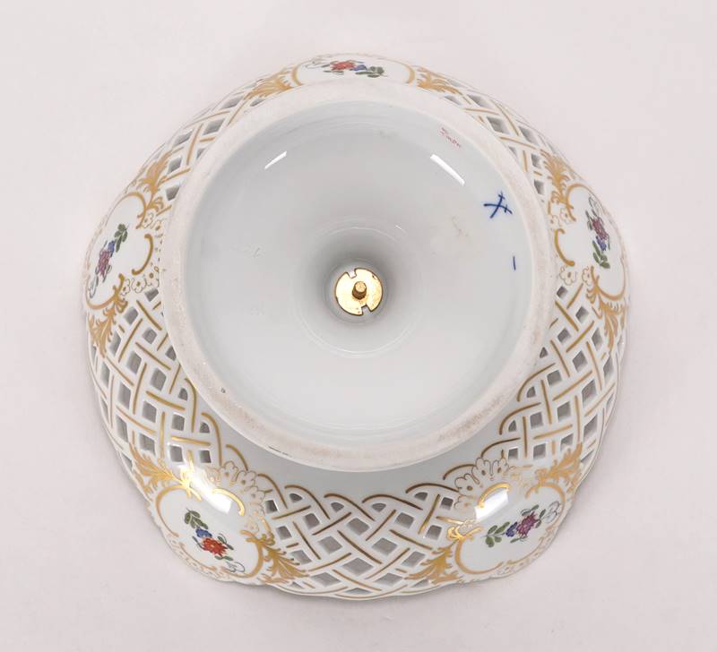 Porzellanmanufaktur Meissen 20. Jh. Dekor indische Blumenmalerei, zweiteilig, mit Goldrand. Schale mit durchbrochen gearbeitetem Rand auf rundem Fuß. Unter dem Boden des Fußes als auch der Schale unterglasurblaue Schwertermarke (1. Wahl) mit Beistrich, Malermarke und Formnummer. Durchmesser ca. 19 cm, Höhe ca. 15,5 cm.