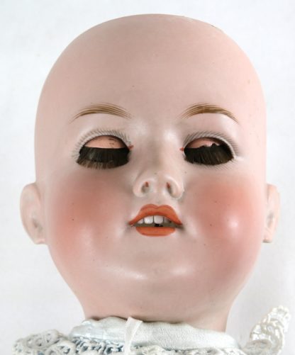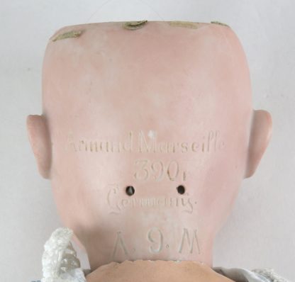 Armand Marseille um 1900. Beweglicher Gliederkörper und zart bemalter Porzellankopf mit offenem Mund mit vier Zähnchen, gemalten Augenbrauen und Schlafaugen. Hinten gemarkt mit Schriftzug, Kürzel A. 9 M. und Formnummer 390. Sehr schöne Kleidung wohl original. Größe ca. 54 cm. Schöner Zustand.