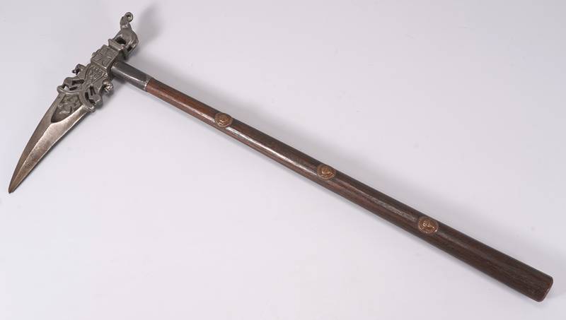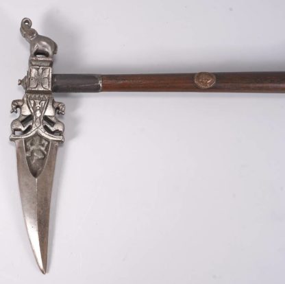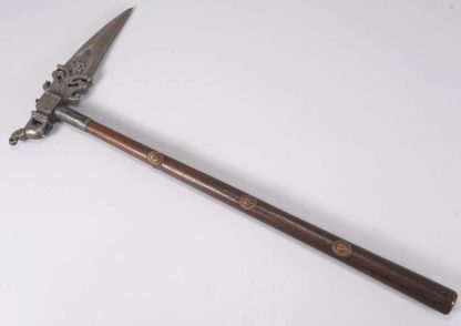 Zaghnal. Holzgriff mit spitzer, zweischneidiger und leicht gebogener Klinge mit Mittelgrat. Klinge mit figurativem Dekor aus Elefant, Tigern und einer Gottheit. Der Griff ist mit sechs runden Metallapplikationen besetzt, darauf sind Masken abgebildet. Gesamtlänge ca. 54,5 cm, Gewicht ca. 620 Gramm.