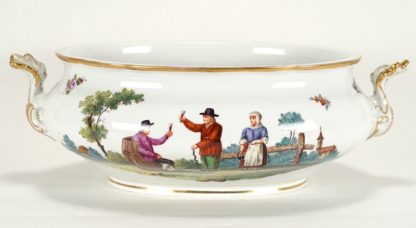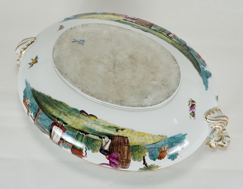 Porzellanmanufaktur Meissen um 1900. Ovale Form mit Akanthusblätterhandhaben. Zwei Wirtshausszenen im Freien, Goldrand und Goldstaffage. Unter dem Boden Knaufschwertermarke und Formnummer. Größe ca. 38 x 25 cm, Höhe ca. 12,5 cm. Ein wohl beim Brennen entstandener Riss horizontal auf der linken Seite. Deckel fehlt.