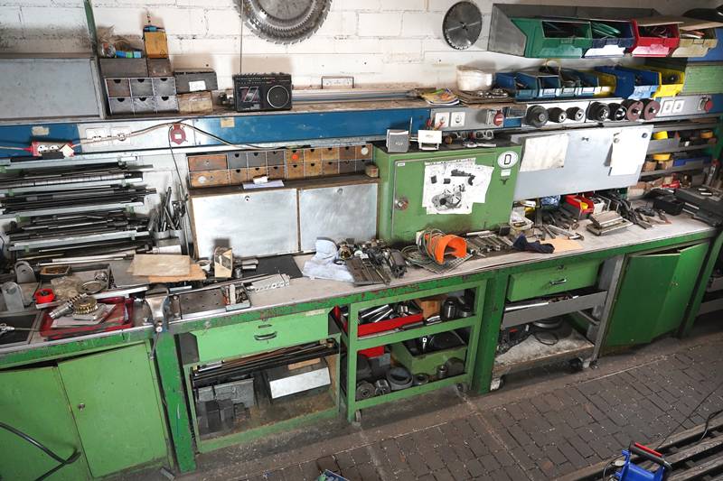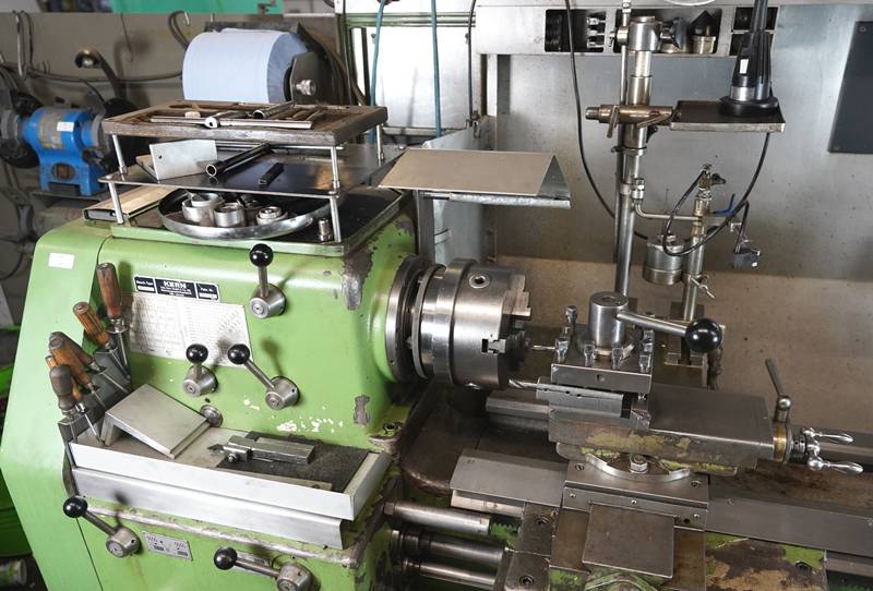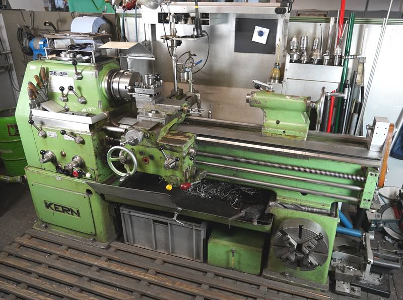 Drehmaschine Kern Typ D 18L. Spitzenhöhe/weite 180 x 760 mm. max. 1.000 U/Min. Reitstock, Dreibackenhalter, 4-fach Stahlhalter. Kühleinrichtung. Zubehör mit kompletter Werkbank gegenüber. Verbrauchsmaterialien wie abgebildet.