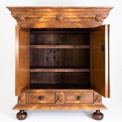 Hallenschrank im Barockstil Um 1900. Großer Schrank auf Balusterfüßen mit zwei Schubladen und Türen mit kissenförmigen Füllungsfeldern und geschnitzten Ranken- und Blumendekor auf den Lisenen. Das Schlüsselloch wird durch ein verschiebbares Zierelement verdeckt. Das Gesims ist mit Löwenköpfen dekoriert und mehrfach profiliert. Der Schrank ist in Palisander furniert. Größe ca. 188 x 175 x 68 cm. This item requires CITES for export outside of the EU!