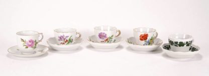 20. Jh. Form Neuer Ausschnitt mit unterschiedlichen Dekoren und diverse unterglasurblaue Schwertermarken. Durchmesser Untere je ca. 11 cm, Höhe Tassen je ca. 6 cm. Dabei eine Mokkatasse mit Unterer von Fürstenberg. Zustand wie abgebildet.