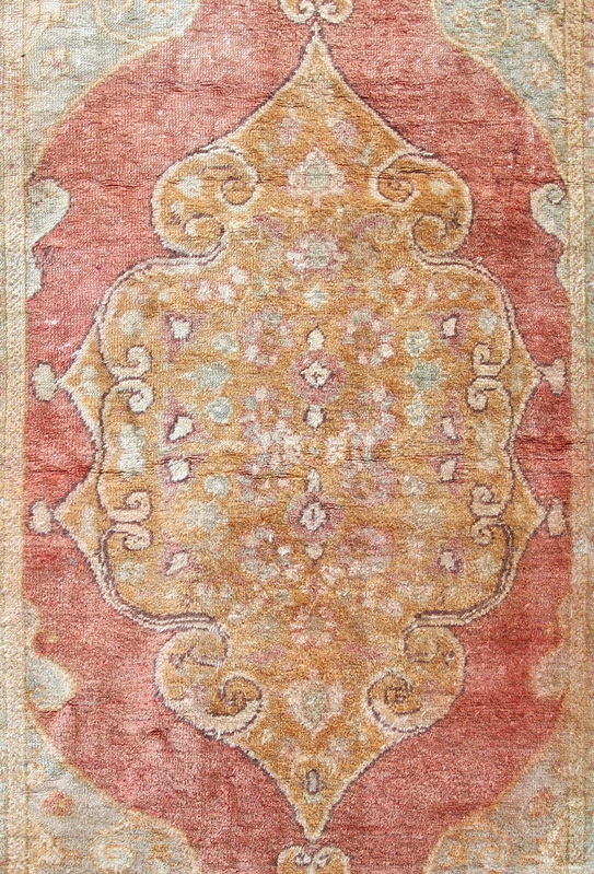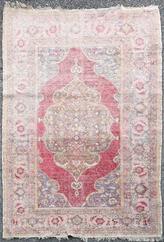 19. Jh. Wolle mit Pflanzenfarben. Außergewöhnliche Bordüren und zentrales Medaillon mit Eckzwickeln und roter Umrandung. Größe ca. 170 x 115 cm, ca. 64 Knoten / qcm. Altersbedingter Zustand, verblichen, teils restauriert.