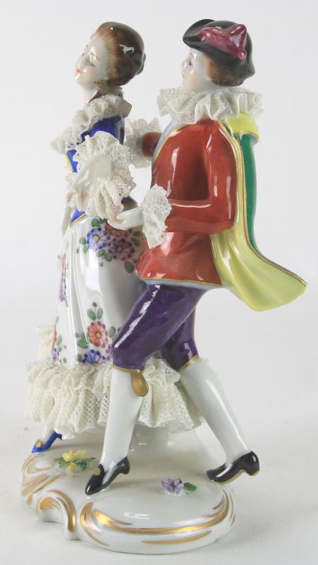 Aelteste Volkstedt 20. Jh. Kavalier mit Krinolinendame. Weißporzellan mit polychromer Bemalung und Goldstaffage. Unter dem Boden blaue Manufakturmarke, Malermarke und Formnummer. Größe ca. 14 x 8 cm, Höhe ca. 17 cm. Guter Zustand.