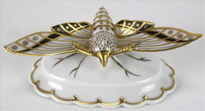 Metzler und Ortloff um 1900. Schmetterling auf getrepptem Sockel. Porzellan mit polychromer- und Goldstaffage. Unter dem Boden Manufakturmarke und Formnummer 4312. Größe ca. 12 x 6 cm, Höhe ca. 4,5 cm.