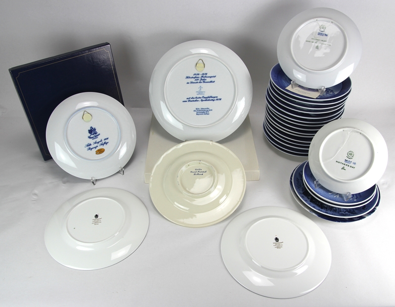 Konvolut Royal Copenhagen Kopenhagen 20. Jh. Porzellan. 16 Weihnachtsteller, durchgehend von 1968 bis 1979, teils doppelt. Limitierte Auflagen. Jeweils unterglasurblaue Malerei. Jeweils unter dem Boden bezeichnet und unterglasurgrüne Manufakturmarke, mit blauer Wellenmarke. Durchmesser ca. 18 cm. Dazu drei Teller Mother' day, einmal von Royal Copenhagen, zweimal von B&G. Dazu noch sieben weitere Teller anderer Manufakturen.