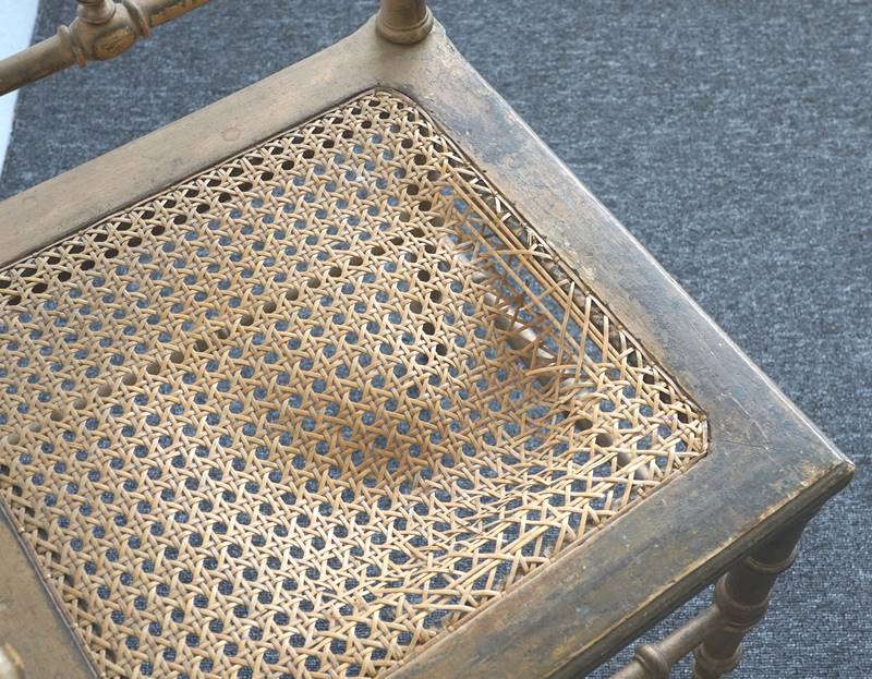Um 1900. Holz, goldstaffiert. Jeweils auf vier gedrechselten Beinen im Verbund, Lehne mit gedrechselter Ballusterreihe. Sitzfläche aus Korbgeflecht. Maximale Größe ca. 42 x 42 cm, Höhe ca. 70 cm, Sitzhöhe ca. 42 cm. Farbe teils stark berieben, Sitzfläche einmal gerissen.