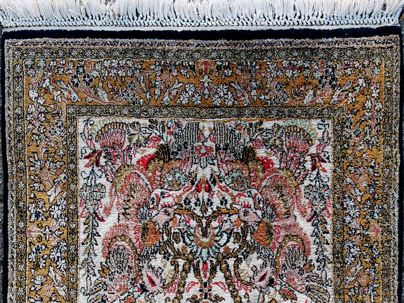 Persien 20. Jh. Baumwolle mit Seidenanteil. Drei Bordüren und florale Gartenszene im Mittelfeld. Größe ca. 142 x 80 cm, ca. 49 Knoten / qcm.