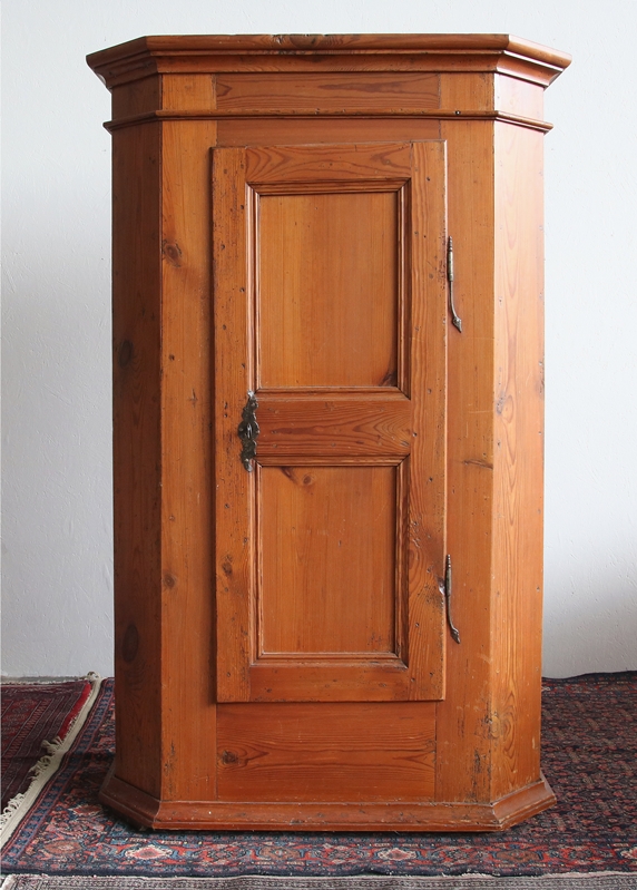 Süddeutsch 18. Jh. Nadelholz. Eintüriger Korpus mit geschrägten Ecken und profiliertem Gesims. Größe ca. 103 x 53 cm, Höhe ca. 170 cm. Beschläge original, ein Schlüssel vorhanden. Altersbedingt guter Zustand.