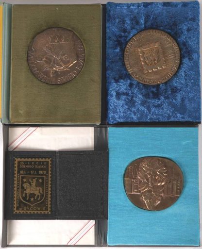 Konvolut Medaillen Polen 20. Jh. Diverse metallische Plaketten und Medaillen. Einmal Kwiaty Ojczyznie, Gewicht ca. 300 Gramm. Einmal Dolnego Slaska 10.1. - 17.1.1970. Sycowie, Gewicht ca. 60 Gramm. Einmal Freundschafts - Briefmarkenausstellung Görlitz - Zgorzelec 1975, Gewicht ca. 215 Gramm. Einmal Okregowa Wystawa Filatelstyczna. Wroclaw - Lipiec 1975, Gewicht ca. 240 Gramm. Gesamtgewicht ca. 815 Gramm.