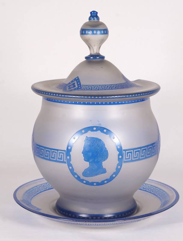 Bowlegefäß Deutsch um 1900. Mattiertes, teils blau gefasstes Glas. Bowlegefäß mit Deckel auf Teller mit geschnittenem, blau gefasstem Dekor in der römischen Formensprache. Durchmesser ca. 28 cm, Höhe ca. 35 cm. Minimal bestoßen.