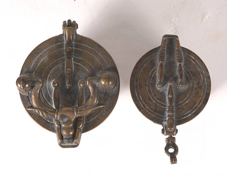 Zwei Bechergewichte Metall. Ein größeres und ein kleineres Bechergewicht. Das größere mit diversen Punzen auf dem Deckel. Durchmesser ca. 6,5/5 cm, Höhe ca. 5/4,5 cm, Gewicht ca. 600/326 Gramm. Vollständig, Zustand wie abgebildet.