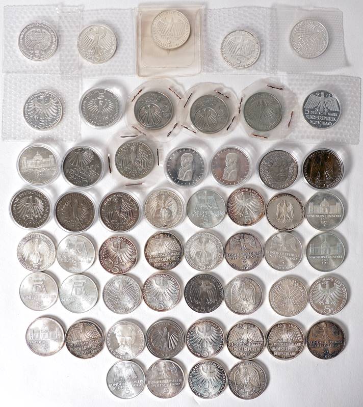 54 Gedenkmünzen. 1 x Max Pettenkofer 1968, 3 x Gerhard Mercator 1969, 2 x Ludwig van Beethoven 1970, 8 x dem Deutschen Volke 1971, 5 x Albrecht Dürer 1971, 3 x Nikolaus Kopernikus 1973, 2 x Frankfurter Nationalversammlung 1973, 1 x 25 Jahre Grundgesetz 1974, 8 x Albert Schweitzer 1975, 1 x Friedrich Ebert 1975, 3 x Heinrich von Kleist 1977, 5 x Europäischer Denkmalschutz 1975, 1 x Otto Hahn 1979, 1x Walter von der Vogelweide 1980, 1 x Martin Luther 1983, 1 x Karl Marx 1983, 2 x Gründung des deutschen Zollvereins 1984, 1 x 150 Jahre Eisenbahn 1985, 2 x Europäisches Jahr der Musik 1985, 1 x Friedrich der Große 1986, 2 x 600 Jahre Universität Heidelberg 1986. Teils in Blistern, teils in Kapseln. Zustand wie abgebildet, bitte selbst besichtigen.