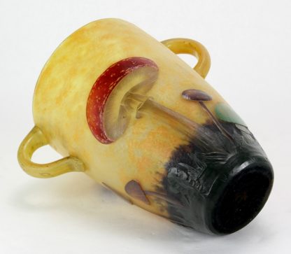 Mushrooms Vase Daum Nancy um 1900. Henkelvase aux champingons aus farblosen Glas mit flockigen hell- und dunkelgelben sowie hellroten Farbeinschmelzungen, außen vorgeätzter, geschnittener und farbig staffierter Dekor mit verschiedenen Pilzen. Matt geätzter Grund, Bodenunterseite mit mattgeschnittener Signatur Daum Nancy mit Lothringerkreuz. Größe ca. 22 x 13 cm. Höhe ca. 20 cm. Guter Zustand.