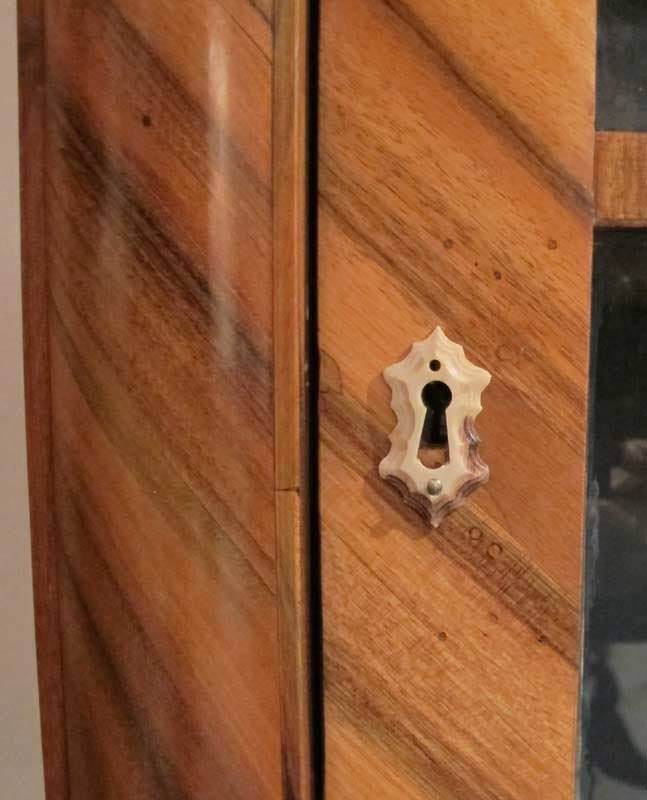 Biedermeier Geschirrschrank 19. Jhd., Donaumonarchie, Nußbaum. Eintüriger Biedermeier Geschirrschrank mit 3/4 Verglasung auf Vierkantfüßen. Größe ca. 101 x 55 cm, Höhe ca. 182 cm. Verglasung gebrochen.