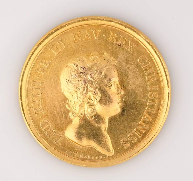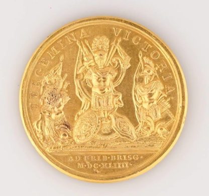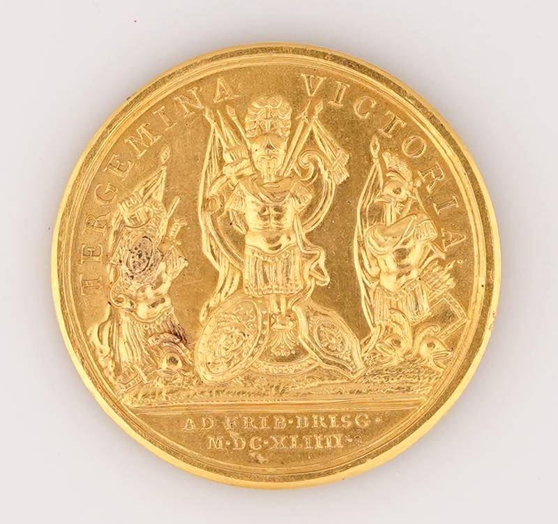 Vergoldete Bronzemedaille 1644 von J. Mauger auf den Sieg der Franzosen bei Freiburg im Breisgau. Jugendliches Brustbild des Königs und Kriegstrophäen. Durchmesser ca. 41 mm, maximale Dicke ca. 3,4 mm. Gewicht ca. 26 Gramm. Selten. Zustand wie abgebildet.
