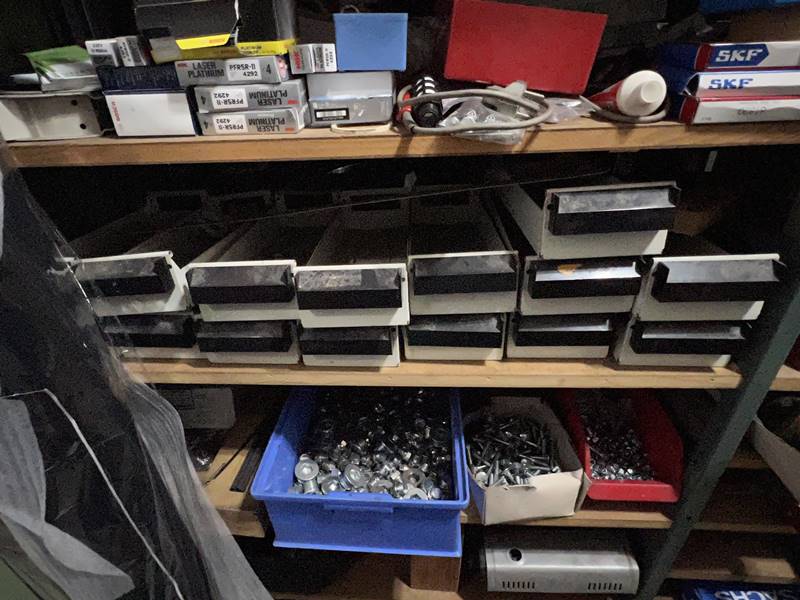2 + 2 Holzregale verbunden, darin und darauf diverse Kfz-Ersatzteile und Werkzeug.