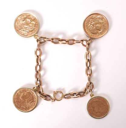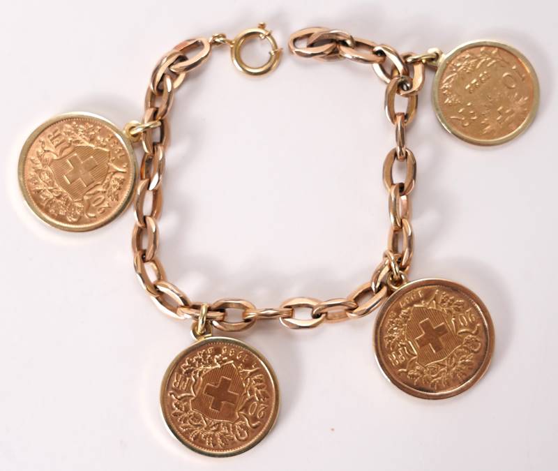 Münzarmband Drei 20 Franken Goldvreneli, zweimal 1935 und einmal 1947, Gold 900. Eine 10 Franken Goldvreneli, Gold 900. Gefasst in Gold 585, teils punziert, teils geprüft, an einem Armband Gold 333, geprüft. Länge des Armbands ca. 18,5 cm, Gesamtgewicht ca. 39,9 Gramm. Zustand wie abgebildet, bitte selbst besichtigen.