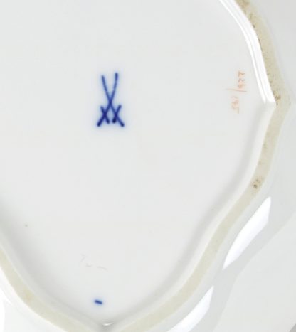20. Jh. Form neuer Ausschnitt mit Blumenmalerei und Goldrand. Unter dem Boden unterglasurblaue Schwertermarke mit zwei Durchschliffen und einem Beistrich sowie Formnummer und Malermarke. Größe ca. 19 x 14,5 cm, Höhe ca. 3,5 cm. Guter Zustand.