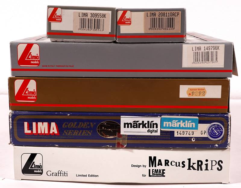 Konvolut LIMA H0, Wechselstrom. Für Märklin Digital, Code 06. Wagenpackung Lufthansa Airportexpress, vierteilig, in OVP 149749. E-Lok, Lufthansa Airportexpress DB 103 101-2, in OVP 208110 ACP. Ein Rheingold Salonwagen, Wagenpackung Graffiti, Design by Marcus Krips, Limited Edition, OVP 149847K. Wagenpackung BB Touropa OVP 149796K. Wagenpackung Rheingold, vierteilig, in OVP 53-149898K, zusätzliche Nr. 9898 (Hannes Fischer), in ungeöffneter OVP. Aus einer süddeutschen Privatsammlung. Zustände wie abgebildet, Funktion nicht geprüft, teils eventuell Fehlteile, teils eventuell beschädigt. Bitte selbst besichtigen.
