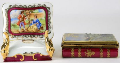 Limoges 20. Jh. Porzellan mit Goldstaffage und gemaltem bzw. Druckdekor. Gedruckte Manufakturmarken. Größe des Döschen in Buchform ca. 8,5 x 6 cm. Guter Zustand.