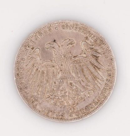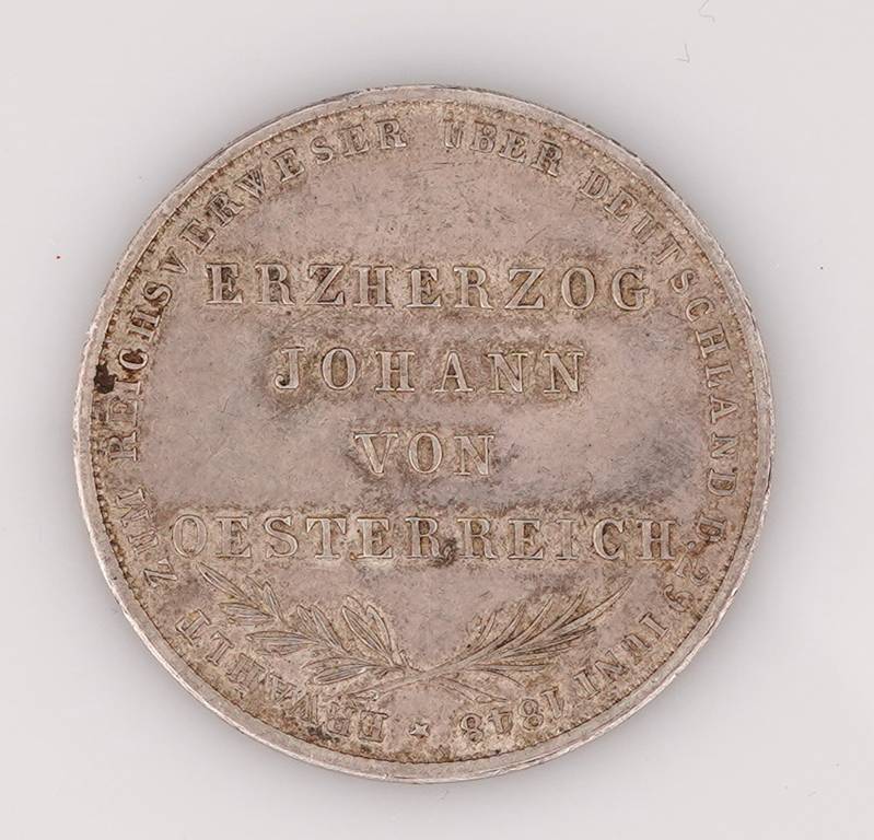 Frankfurt Stadt 1848. Auf die Wahl von Erzherzog Johann von Österreich zum Deutschen Reichsverweser durch das Paulskirchen-Parlament. Durchmesser ca. 36,2 mm, max. Dicke ca. 2,3 mm, Gewicht ca. 21,2 Gramm. Dav.644 AKS 39. Zustand wie abgebildet.