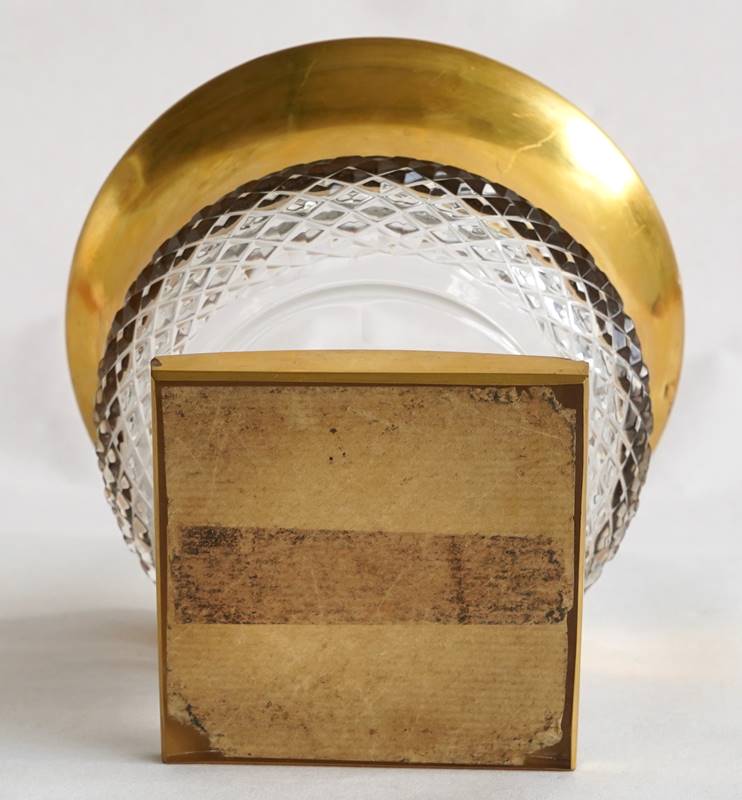 Wohl Josephinenhütten, Schlesien 20. Jh. Glas, facettiert sowie Brillantschliff. Ausladende Schale auf quadratischen Fuß. Reiche Goldstaffage an der Öffnung und dem Fuß. Entwurf Franz Pohl um 1890. Durchmesser ca. 16 cm, Höhe ca. 15,5 cm. Gewicht ca. 1,74 kg. Goldstaffage stark berieben.