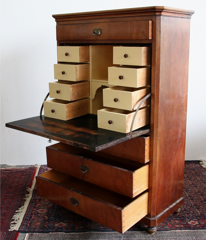 Deutsch 19. Jh. Nußbaum furniert. Auf vier profiliert kugeligen Füßen, dreischübiger Korpus mit klappbarer Schreibplatte und Kopfschub. Geschrägte Ecken und überkragende Platte. Reiches Innenleben. Größe ca. 105 x 48 cm, Höhe ca. 159 cm. Zwei Schlüssel vorhanden. Teils altrestauriert.