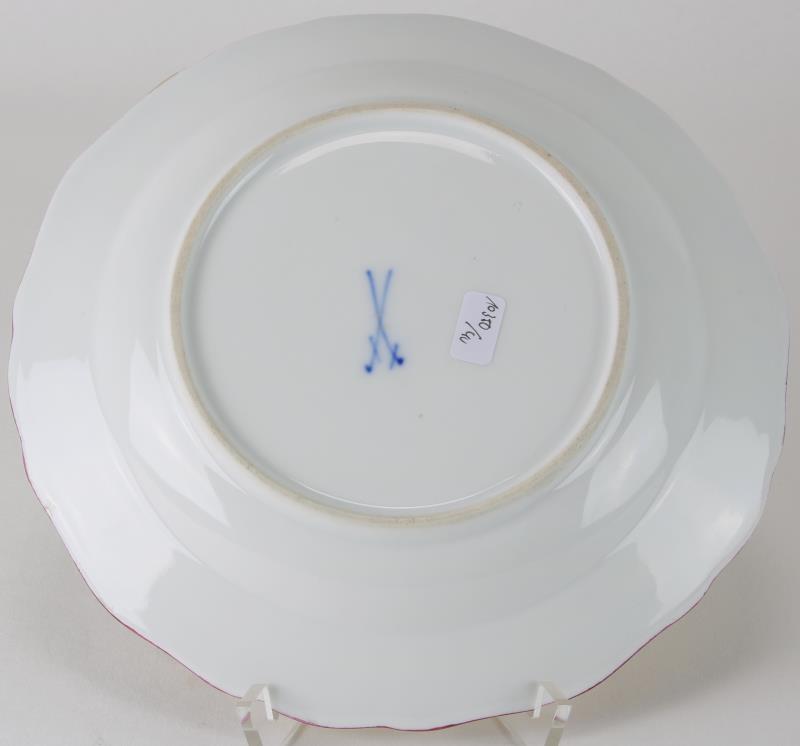 19. Jh. Tiefgemuldete Form mit Goldstaffage und gemalter Genreszene im Spiegel mit Hundegespann und verunfallendem Knaben. Unter dem Boden, blaue Knaufschwertermarke und Formnummer, 2 Schleifstriche. Durchmesser ca. 19 cm. Schöner Zustand.