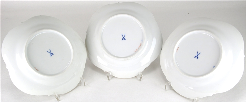 Meissen 20. Jh. Form 1001 Nacht, Entwurf Prof. Heinz Werner mit unterschiedlichen Bilddekoren und Goldhöhung. Unter dem Boden unterglasurblaue Schwertermarke und Malermarke. Durchmesser je ca. 17 cm, Höhe ca. 3 cm. Guter Zustand, keine Chips.