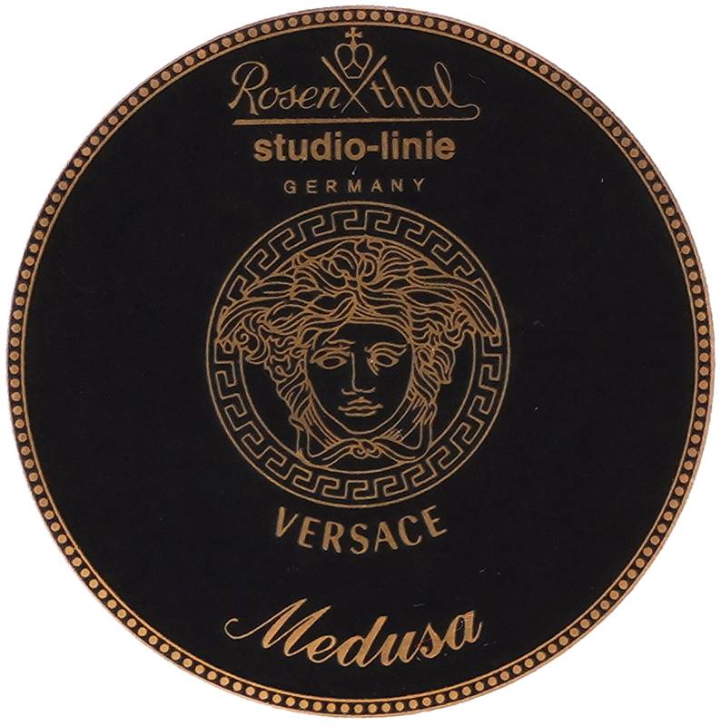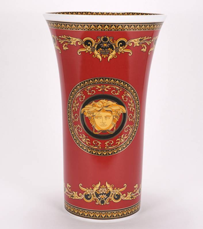 Vase Rosenthal Um 1990. Versace für Rosenthal. Medusa-Design. Karminroter Fond und schwarz-goldenes, antikisierendes Dekor mit Medusaköpfen. Unter dem Boden Marke. Durchmesser ca. 21 cm, Höhe ca. 34,5 cm.