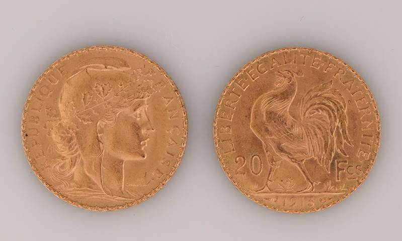 Zwei Goldmünzen 20 Franc 1913, jeweils ca. 21,1 mm, je ca. 6,45 Gramm. Zustand wie abgebildet.