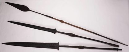 Drei afrikanische Speere Metall und Holz. Einmal blattförmige Metallspitze mit Mittelrippe, zweimal lanzettförmige Metallspitze. Die Holzgriffe sind jeweils geschnitzt und mit dekorativen Mustern verziert. Max. Die Metallspitzen sind auf die Holzstäbe aufgesteckt. Länge ca. 176 cm. Zustand wie abgebildet, bitte selbst besichtigen.