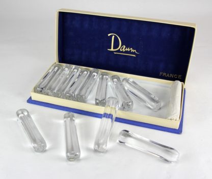 Messerbänkchen Daum Nancy um 1960. Glas. Zwölf längsrechteckige Messerbänkchen mit eingezogenen Seiten. Jeweils auf einem Ende signiert, teils schwer erkennbar. Daum Nancy. Länge jeweils ca. 9 cm. Teils etwas oberflächig verkratzt.