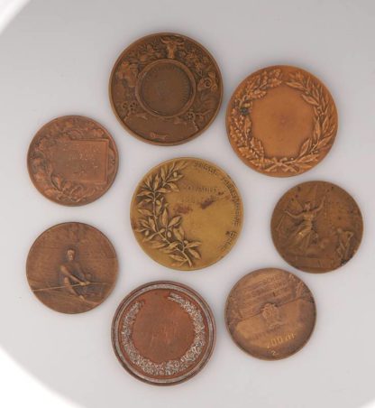 Deutschland und Frankreich, meist 1920er und 1930er Jahre. Insgesamt acht Stück. Teils Medaillen für Sportwettbewerbe. Verschiedene Materialien, verschiedene Größen. Maximaler Durchmesser ca. 50 mm. Gesamtgewicht ca. 317 Gramm. Zustand wie abgebildet.