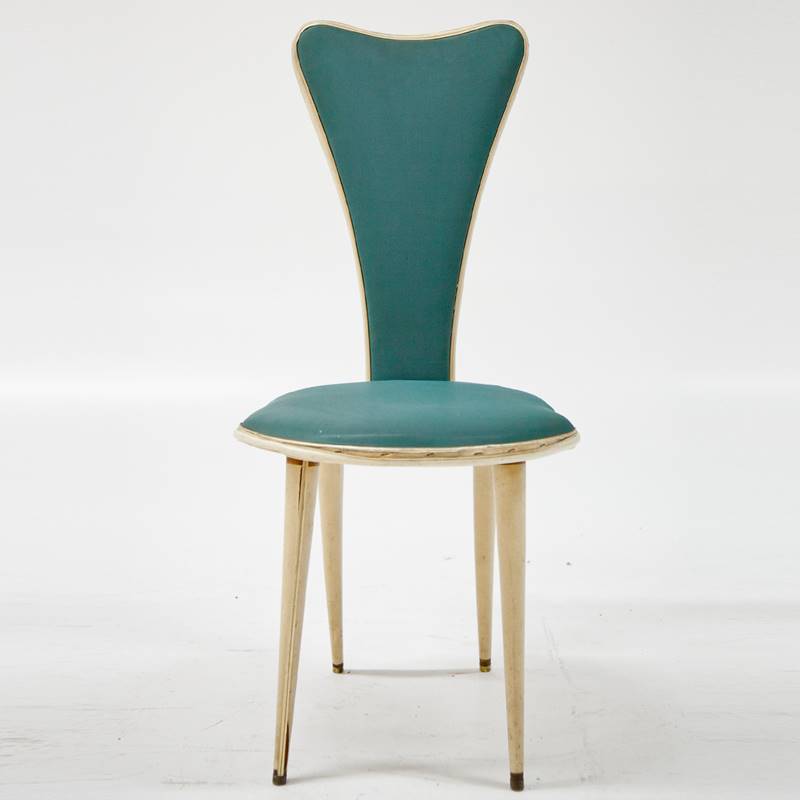 Paar Umberto Mascagni Stühle Italien 1950er. Zwei Esszimmerstühle mit hoher Lehne von Umberto Mascagni entworfen. Die konischen Beine und das Gestell sind cremefarben, der Bezug ist blau. Größe ca. 46 x 47 cm, Höhe ca. 97 cm, Sitzhöhe ca. 46 cm. Nicht restauriert.