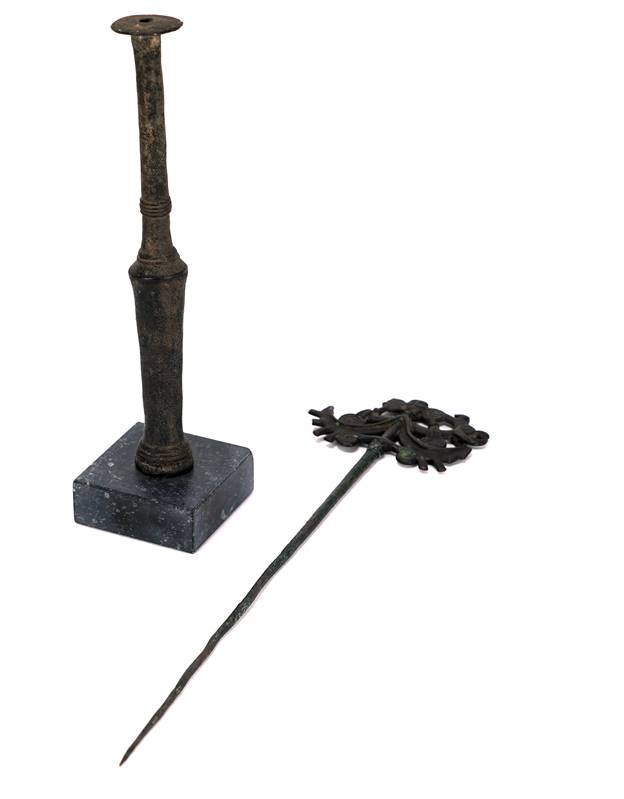 Standarte Bronze-Standarte. Luristan, wohl 5. Jh. v. Chr. Bestehend aus einem als Ständer fungierenden Tubus mit Ringornamentik, nach oben sich verjüngend und mit tellerförmigem Abschluss. Darauf eine Bronzenadel mit figuralem Kopf. Steht lose auf einem nicht dazugehörigen Ständer. Höhe Tubus ca. 19 cm. Höhe Bronzenadel ca. 29 cm. Höhe gesamt ca. 32 cm. Ein kleiner Teil der Nadelkopffigur abgebrochen. Bruchkante zwischen Nadel und Kopf. Geklebt.