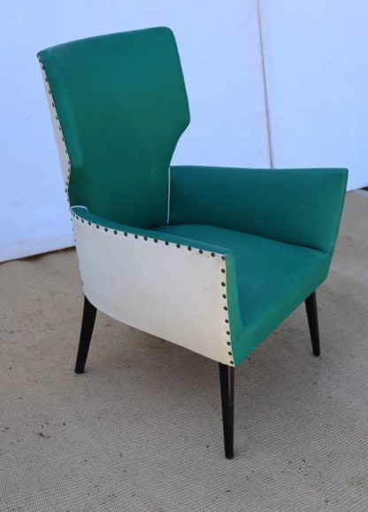 Design Ensemble Italien Mitte 20. Jh. Zwei italienische Mid-Century Sessel und ein Zweisitzer auf konischen Spitzbeinen, mit einem grünen und weißen Kunstleder bezogen und genietet. Größe Zweisitzer ca. 142 x 50 cm, Höhe ca. 84 cm, Sitzhöhe ca. 40 cm. Größe Sessel ca. 70 x 50 cm, Höhe ca. 84 cm, Sitzhöhe ca. 40 cm. Bezug teils beschädigt.
