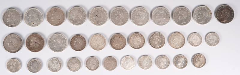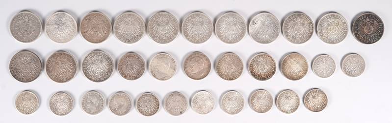 Deutsches Kaiserreich, Otto König von Bayer 1886-1916. 14 x 5 Mark Münzen: 1888, 1891, 1894, 1895, 1898, 1900, 1901, 1902, 1903, 1904, 1906, 1907, 1908, 1913. 6 x 3 Mark Münzen: 1908, 1909, 1910, 1911, 1912, 1913. 13 x 2 Mark Münzen: 1888, 1891, 1899, 1900, 1901, 1902, 1903, 1904, 1905, 1906, 1907, 1908, 1913. Zustand wie abgebildet, bitte selbst besichtigen.