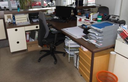 Empfangtheke im Empfangsbereich, mit den beiden Schreibtischen, drei Unterschubcontainer, 2 Bürodrehstühle. Achtung: abgebildete PC und Technik separat.