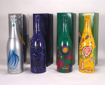 Champagner Taittinger Collection. Reims 1978-1998. Nine bottles of Taittinger Champagne Brut Millésime, each in a design created by artists. 1978 Victor Vasarely, 1981 Arman, 1982 André Masson, 1983 Vieira da Silva, 1986 Hans Hartung, 1988 Tishimitsu Imai, 1990 Corneille, two times 1992 Matta and 1998 Zao Wou-Ki. Each signed in print. Each with original cardboard (missing for Arman, one time Matta and Wou-Ki). Each 750 ml. Cartons partly a little bit damaged. Comes with a promotional photo of the collection framed behind glass and another box for the Roy Lichtenstein bottle.
