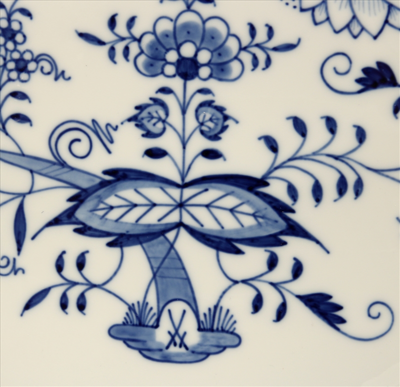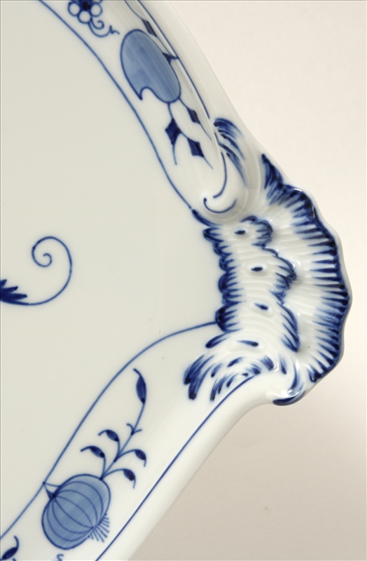 20. Jh. Dekor Zwiebelmuster. Eine Schleifenplatte, Größe ca. 41 x 28 cm, eine gewellte Ovalplatte und ein rechteckiger Untersetzer ca. 27 x 16 cm. Jeweils unterglasurblaue Schwertermarke mit einem Schleifstrich. Guter Zustand ohne Chips.
