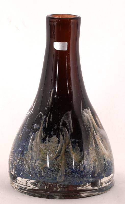 1905-1992. Ikora-Vase. Keulenform. Braunes Kristallglas, farblos überfangen, dickwandig, vom Boden ansteigendes Dekor mit Oxydeinschmelzungen und Blasen. Unter dem Boden Signatur 4-9 K. Wiedmann XS 375. Durchmesser ca. 14,5 cm, Höhe ca. 24,5 cm.