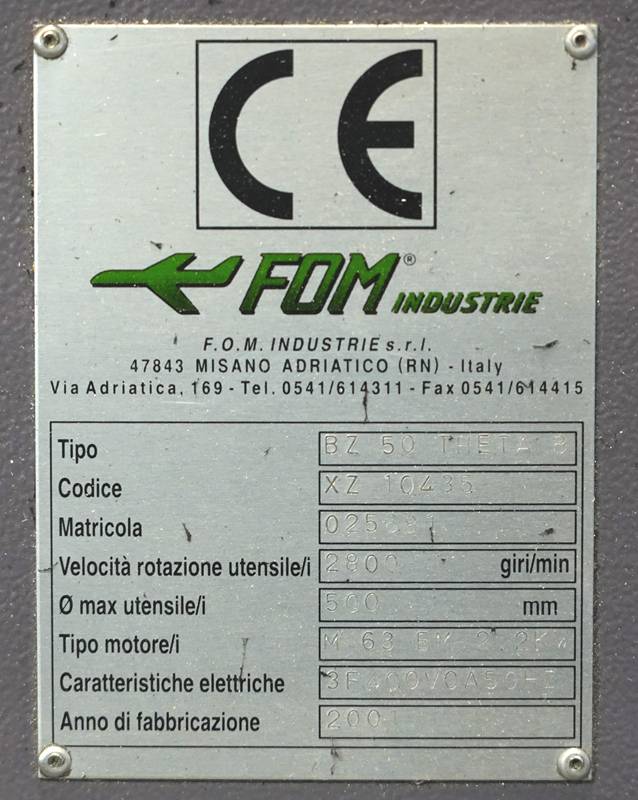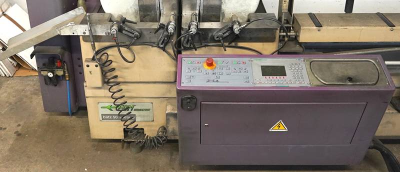 Doppelkopfsäge FOM Industrie. Blitz 50 THETA Bj. 2001. Sägeblatt max. 500 mm, Länge max. 6.600 mm. Höhe max. 400 mm. Zusätzliche Sägeblätter anbei.