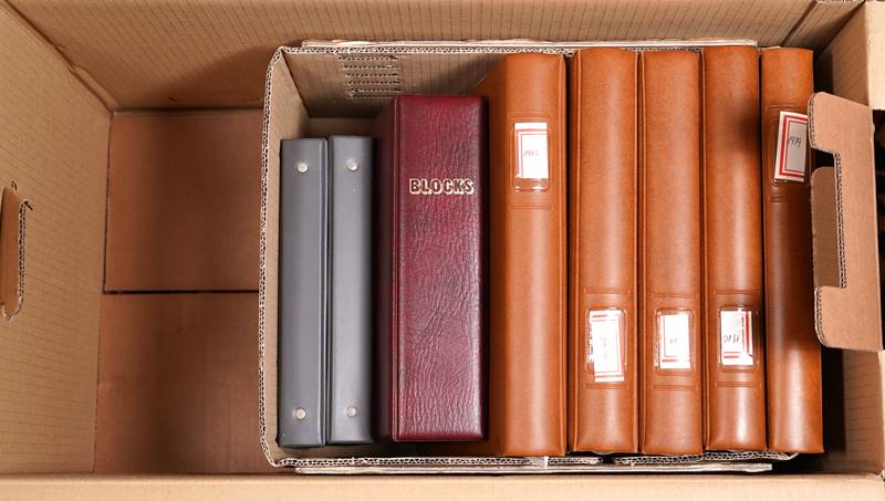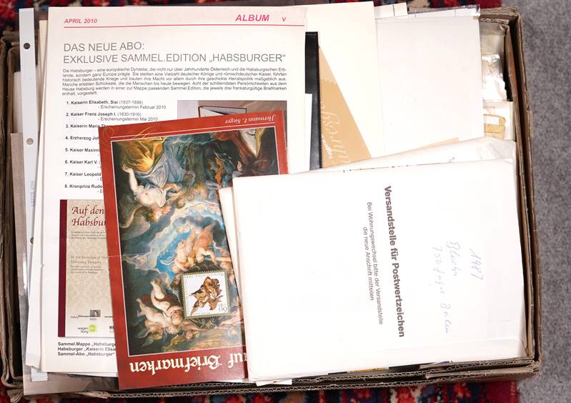 Großes Konvolut Briefmarken Unberührter Sammlernachlass einer Erbengemeinschaft mit Marken meist Europa von der Frühzeit bis 2021. Der Sammler hat tausende DM für sein Hobby über den Versandhandel ausgegeben und eine Unmenge an philatelistischem Material hinterlassen und daher handelt es sich um eine wahre Fundgrube die Sie unbedingt besichtigen sollten. Die Erbschaft enthält u. a. teils mehrfach Jahresbücher Deutschland (ab 1974, 74 Stück + 2002-2021 einmal kpl. (über 1.000.- € Porto!), auch Österreich (2005 - 2021 komplett) und Italien (8 diverse). Eine komplette Sammlung Europablocks postfrisch in 6 hochwertigen Vordruckalben (1979 - 1983 komplett). Diverse Ersttagsblätter in 13 hochwertigen Alben in Schubern, Deutschland in 5 hochwertigen Alben in Schubern 2001 - 2010 komplett, jeweils postfrisch und gestempelt (über 400.- € Porto). Unmengen an Bogenware, Deutschland meist 1970 - 1990 er Jahre. 12 Einsteckbücher, Doubletten, postfrisch und gestempelt. Sammlungen in 11 Lindner Vordruckalben, DDR, Deutschland, Berlin, Lichtenstein, Österreich. Diverse Motivsammlungen in mehreren Alben, u.a. Altdeutschland. In 6 Ordnern ETB, Bund und ein Karton mit losen Briefmarken, Blöcken etc. Interessante Briefe auch mit Mehrfachfrankaturen. Bitte alles selbst besichtigen, keine Gewähr für Vollständigkeit.